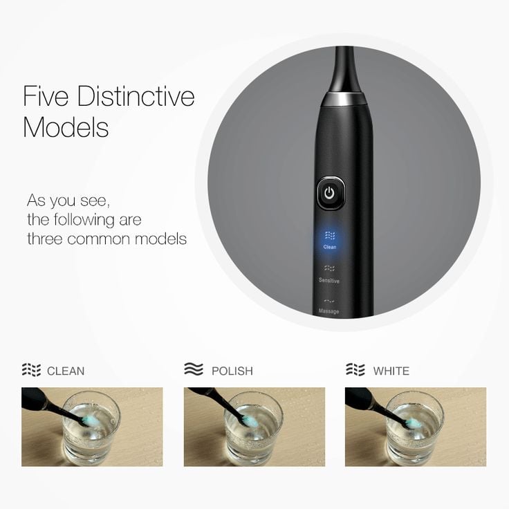 فرشاة الأسنان الكهربائية Digoo DG-YS11 5 قابلة لإعادة الشحن مع 5 أوضاع تنظيف ، حيث تتوفر على 5 وسائط تنظف مناطق يصعب على الفرشاة العادية الوصول إليها ، اذ تقوم بأدوار مختلفة منها إزالة البكتيريا و تنظيف الأسنان الحساسة واللثة بطريقة لا تسبب الالم ، كما تقوم بتدليك الأسنان واللثة و تبييضها و كذا تلميعها .