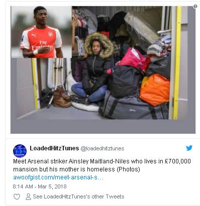 لاعب خط وسط أرسنال أينسلي مايتلاند نيلس يتقاضى شهرياً 136 ألف جنيه أسترليني، وبالتالي فهو "غارق" في المال. لكن والدته تعيش في حاوية تفتقر لمؤهلات العيش البسيط. ولهذا أطلقت صرخة عبر "دي سان" فهل من مستجيب؟!
