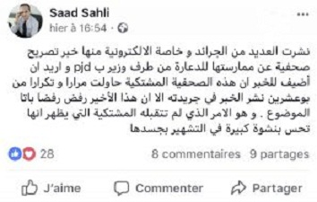 وقال المحامي في تدوينته: "‘نشرت العديد من الجرائد و خاصة الالكترونية منها خبر تصريح صحفية عن ممارستها للدعارة من طرف وزير ب pjd و اريد ان أضيف للخبر ان هذه الصحفية المشتكية حاولت مرارا و تكرارا من بوعشرين نشر الخبر في جريدته الا ان هذا الأخير رفض رفضا باتا الموضوع . و هو الامر الذي لم تتقبله المشتكية التي يظهر انها تحس بنشوة كبيرة في التشهير بجسدها’.