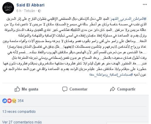 و كشف الدكتور في تدوينة على الفيسبوك تفاصيل واقعة انقاذ عدد من المرضى على يد هذا المواطن الشهم دون أن يكترث لما قد يتعرض له من مكروه ، حيث قال "السيد اللي دخل للإنعاش ديال المستشفى الإقليمي بتطوان البارح، على إثر الحريق الذي نشب في مصحة خاصة، وكان هو أخطر حالة في مجموع الضحايا، ماكان لا مريض لا ناعس تما، ولا من عائلة مريض ولا مرتفق...السيد كان دايز من حدى الكلينيك فطاكسي كبير غادي للفنيدق، وشاف الدخان والجوقة، ونزل يقدم يد المساعدة في إنقاذ مايمكن إنقاذه في أسمى تجليات الإنسانية والشهامة والمواطنة الحقة....".