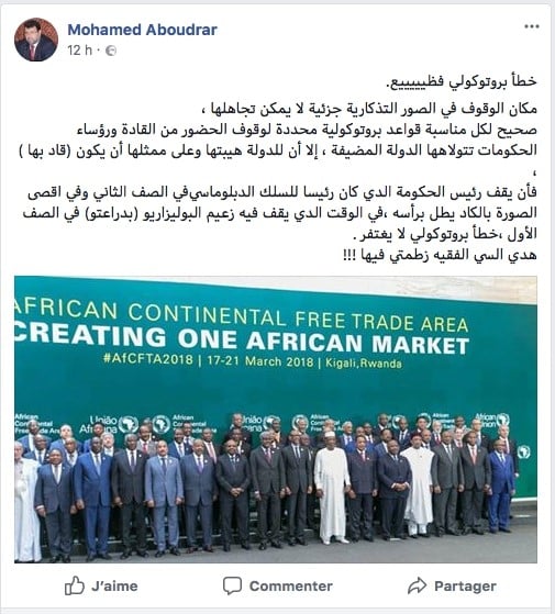 وشدد أبودرار على أن : " مكان الوقوف في الصور التذكارية جزئية لا يمكن تجاهلها"، و أضاف المتحدث : " صحيح لكل مناسبة قواعد بروتوكولية محددة لوقوف الحضور من القادة ورؤساء الحكومات، تتولاها الدولة المضيفة ، إلا أن للدولة هيبتها وعلى ممثلها أن يكون (قاد بها)، مستطردا : "  فأن يقف رئيس الحكومة الذي كان رئيسا للسلك الدبلوماسي في الصف الثاني وفي اقصى الصورة بالكاد يطل برأسه ، في الوقت الذي يقف فيه زعيم البوليساريو (بدراعتو) في الصف الأول ، خطأ بروتوكولي لا يغتفر" .