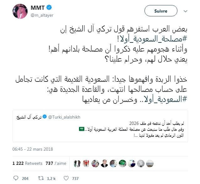 وانتقد آل شيخ موقف الحياد، الذي اتخذه المغرب من الأزمة الخليجية وكتب في "تغريدة" أخرى: "هناك من أخطأ البوصلة.. إذا أردت الدعم فعرين الأسود في الرياض هو مكان الدعم، ماتقوم به هو إضاعة للوقت.. دع "الدويلة" تنفعك...! رسالة من الخليج إلى المحيط".