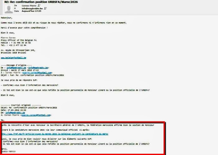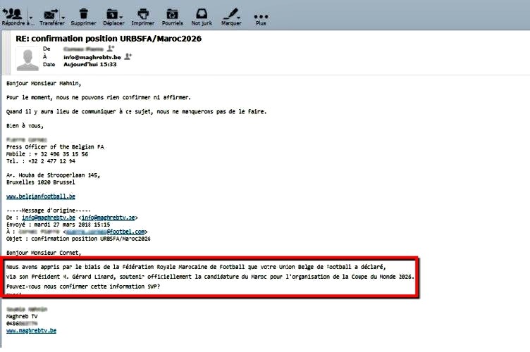 بعد أن أعلنت الجامعة الملكية المغربية لكرة القدم، أمس الثلاثاء عبر بلاغ رسمي لها، أن الإتحاد البلجيكي لكرة القدم، قد عبر عن دعمه لملف ترشيح المغرب من أجل تنظيم مونديال سنة 2026، أكدت قناة " مغرب تيفي " البلجيكية، انها راسلت في هذا الصدد الاتحاد البلجيكي لكرة القدم، من أجل التأكد من مدى صحة هذا الخبر، سيما بعد اللقاء الذي جمع أمس، بين فوزي لقجع رئيس الجامعة، ونظيره جيرار ليينارد، حيث أكد المصدر المذكور، أن رد الاتحاد البلجيكي كان صادما جدا، عقب نفيه عبر رسائل إلكترونية (الوثيقة 1 )، أن يكون قد أعلن عن دعمه الرسمي ترشيح المغرب لاحتضان كأس العالم 2026.