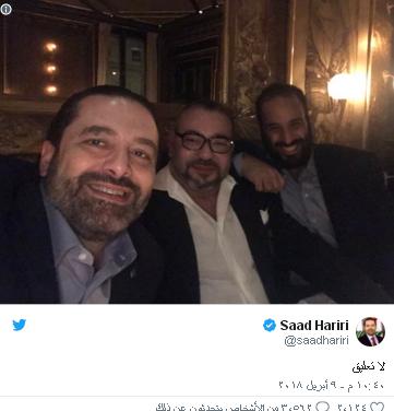 نشر رئيس الحكومة اللبنانية سعد الحريري، قبل قليل، صورة على حسابه الرسمي بموقع التويتر ، جمعته بالملك محمد السادس وولي العهد السعودي محمد بن سلمان بالعاصمة الفرنسية باريس.