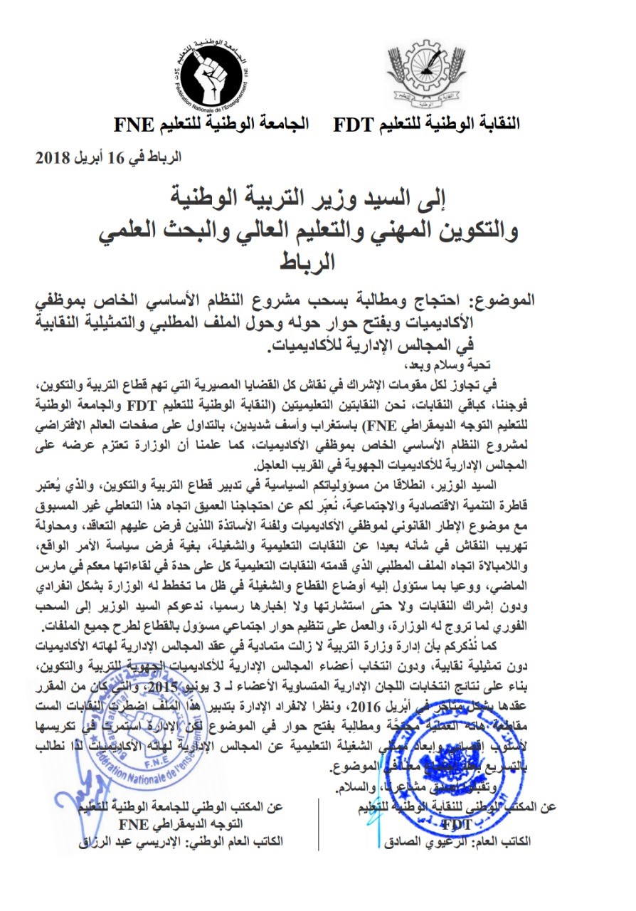 وعبرت النقابتين المذكورتين في مراسلتهما عن احتجاجها العميق في التعاطي مع موضوع الإطار القانوني لموظفي الأكاديميات ولفئة الأساتذة اللذين فرض عليهم التعاقد، ومحاولة تهريب النقاش في شأنه بعيدا عن النقابات التعليمية والشغيلة، بغية فرض سياسة الأمر الواقع.