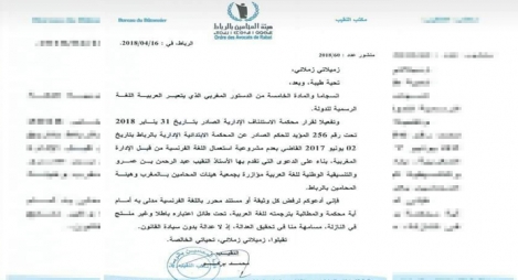 اعتبرت نقابة المحامين بهيئة الرباط، أن جميع الوثائق والمستندات المحررة باللغة الفرنسية غير شرعية وغير قانونية