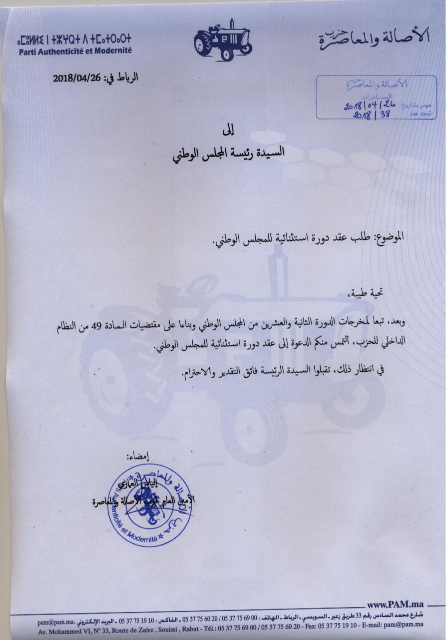 وأشارت رسالة "العماري" كذلك، إلى أن طلب عقد دورة استثنائية للمجلس الوطني، يأتي انسجاما مع مقتضيات المادة 49 من النظام الداخلي للحزب.