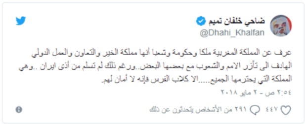 وأوضح خلفان في سلسلة تغريدات عبر حسابه في "تويتر" أنه "عُرف عن المملكة المغربية ملكاً وحكومة وشعباً أنها مملكة الخير والتعاون والعمل الدولي الهادف إلى تآزر الأمم والشعوب مع بعضها البعض، ورغم ذلك لم تسلم من أذى إيران وهى المملكة التي يحترمها الجميع، إلا كلاب الفرس فإنه لا أمان لهم".