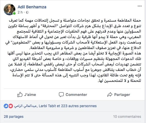 في تدوينة له عبر حسابه الخاص على الفيسبوك، اكد القيادي الاستقلالي عادل بنحمزة أن : "حملة المقاطعة مستمرة وتحقق نجاحات متواصلة و تسجل التحاقات مهمة كما تعرف تنوع و تعدد في طرق الإبداع بشكل هزم شركات التواصل "المحترفة" و أظهر بساطة تكوين المسؤولين عنها وعدم قدرتهم على فهم الخلفيات الإجتماعية و الثقافية للمجتمع المغربي"، مضيفا أنها : " حملة لا يبدو أنها ظرفية بل بدأت تعبر عن تحول في أنماط الاستهلاك وساهمت ردود الفعل الاستعلائية لأصحاب الشركات و مسؤوليها و بعض "المتطوعين" في الدفاع عنها، في تعزيز صفوف المقاطعين و شرعية و مشروعية المقاطعة ".