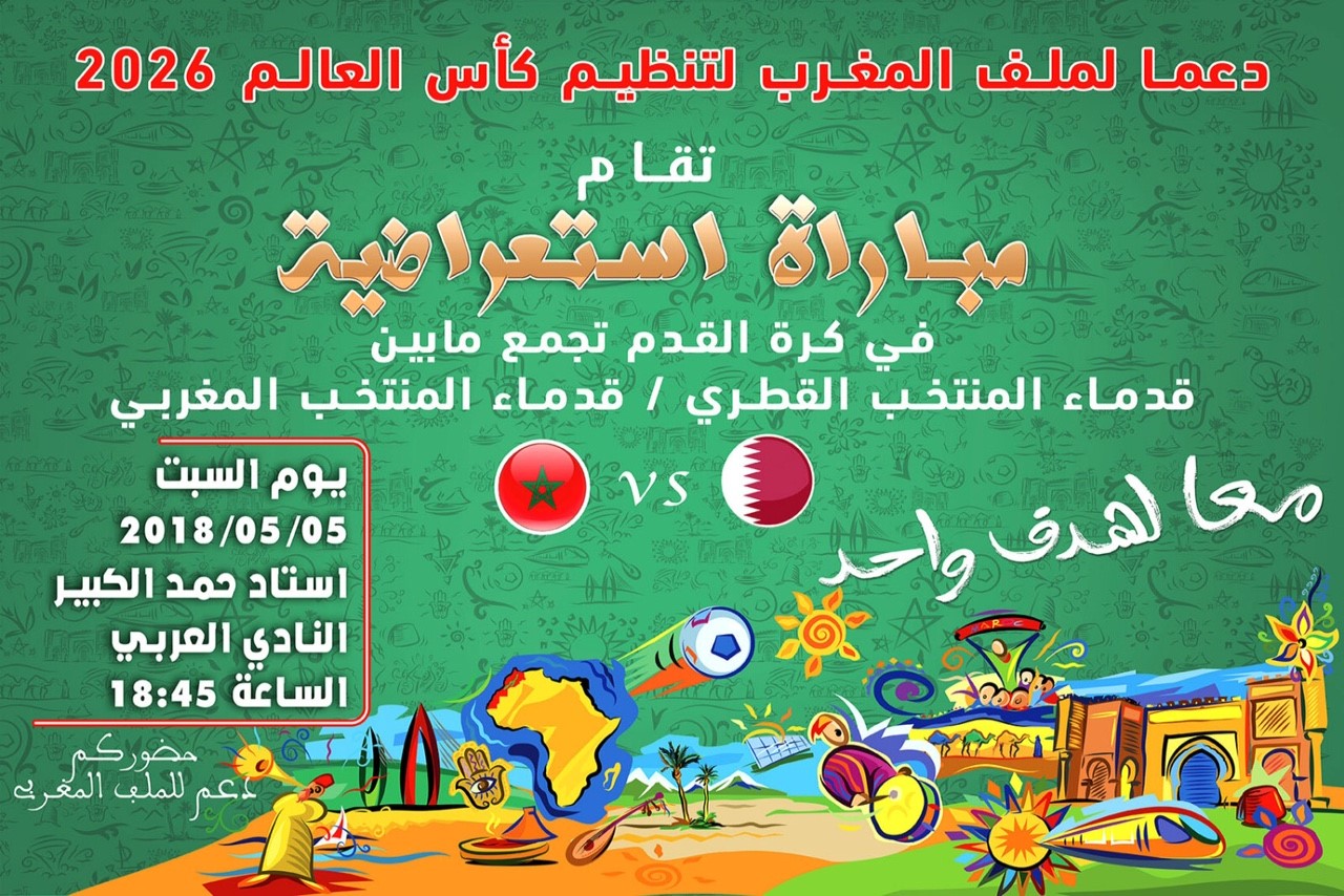 تنظم الجالية المغربية في قطر يوم غد السبت مباراة استعراضية في كرة القدم بين قدماء المنتخب القطري وقدماء المنتخب المغربي بداية من السابعة إلا ربع مساء في ملعب العربي بالتعاون مع سفارة المملكة المغربية في الدوحة و رعاية الخطوط الملكية المغربية في مبادرة تهدف إلى إعلان دعم ملف ترشح المملكة المغربية لاحتضان كأس العالم 2026.