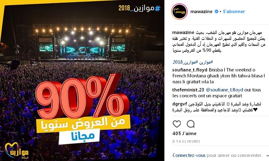 وأرفقها بتدوينة ورد فيها " مهرجان موازين هو مهرجان للشعب، بحيث يمكن للجميع حضور السهرات والحفلات الفنية وتعتبر هذه من السمات والقيم الذي تطبع المهرجان بحيث إن الدخول المجاني يغطي 90 في المائة من العروض السنوية."
