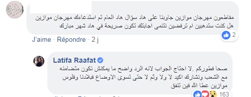 موقف لطيفة رأفت جاء ردا على سؤال موجه إليها في صفحتها الفايسبوكية ورد فيه "مقاطعون مهرجان موازين جاوبنا على هاد سؤال هاد العام إن تم استدعاءك لمهرجان موازين هل كنت ستذهبين ام ترفضين نتنمى اجابتك تكون صريحة في هاد شهر مبارك" .