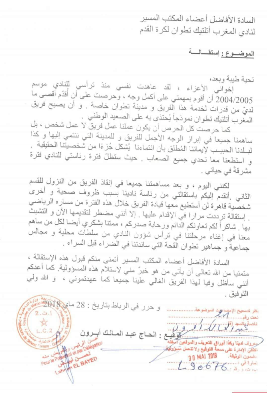 قدم عبد المالك أبرون ، اليوم الاربعاء، استقالته من رئاسة فريق المغرب التطواني بعد مسيرة تسيير حافلة دامت 14 سنة تميزت بتحقيق أول لقبين في تاريخ الماط وذلك باحراز لقب البطولة الاحترافية سنتي 2012 و 2014.