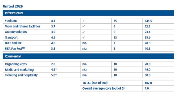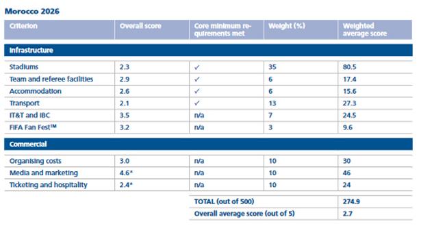 ونشرت "الفيفا" التقرير الكامل للجنة التقييم على موقعها الرسمي ، حيث حصل الملف الأمريكي على 4 نقاط من أصل 5 فيما حصل الملف المغربي على 2.7 نقطة من أصل 5.