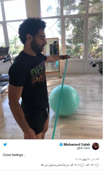 ونشر صلاح صورة على "تويتر" اليوم الأحد 3 يونيو / حزيران، تظهر ممارسته لبعض التمارين الرياضية، وعلق عليها بعبارة "لدي شعور جيد".