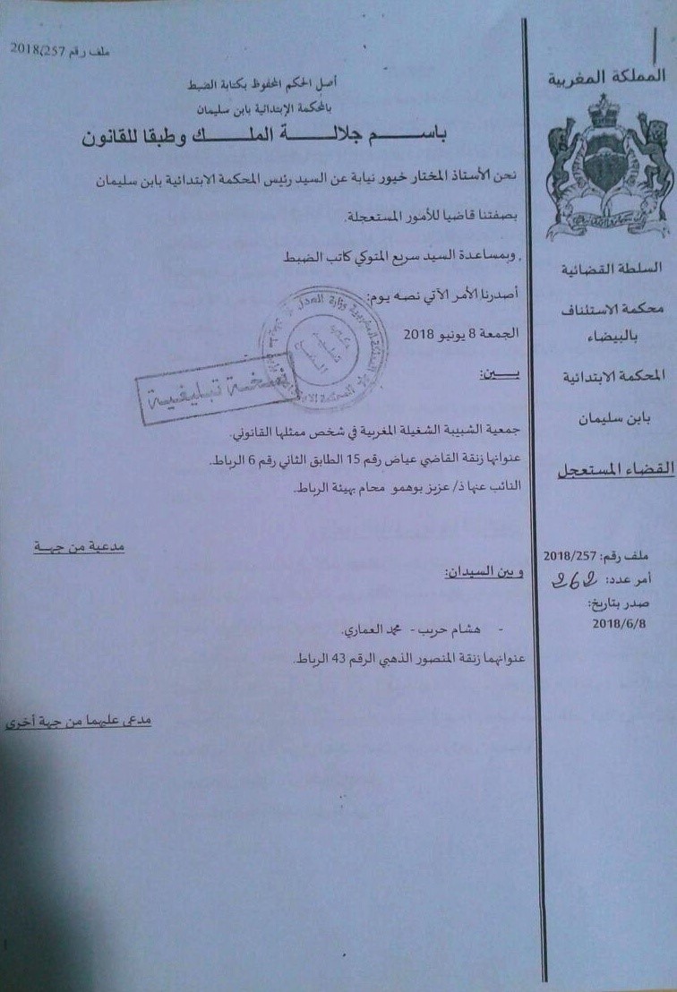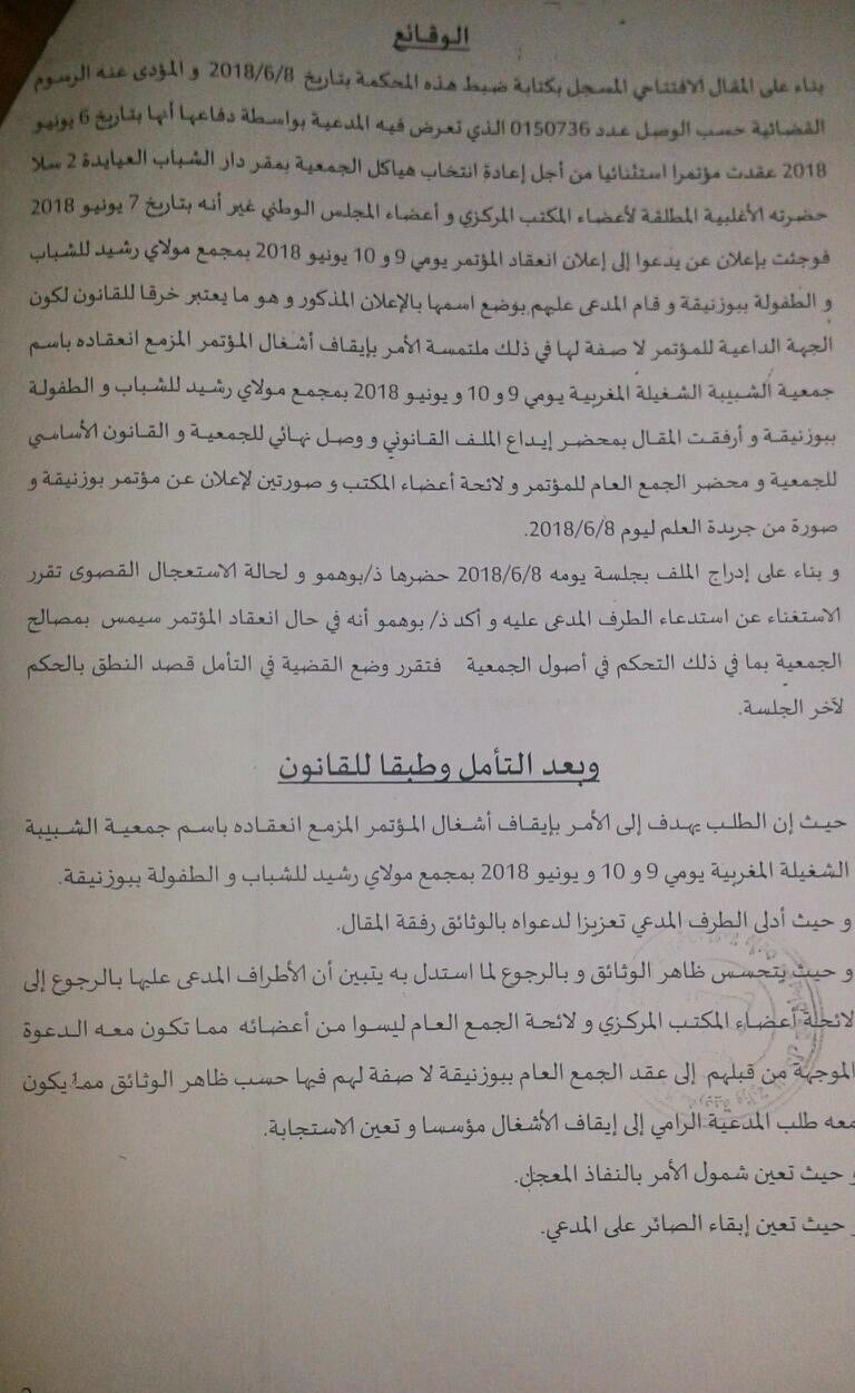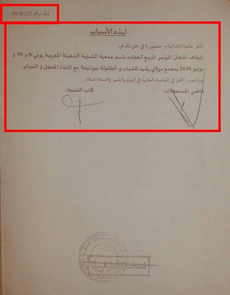 قضت المحكمة الابتدائية بابن سليمان في الملف رقم 2018/257 بحكم استعجالي " بإيقاف أشغال المؤتمر المزمع انعقاده باسم جمعية الشبيبة الشغيلة المغربية يومي 9 و 10 يونيو 2018 بمجمع مولاي رشيد للشباب و الطفولة ببوزنيقة مع النفاذ المعجل و الصائر".