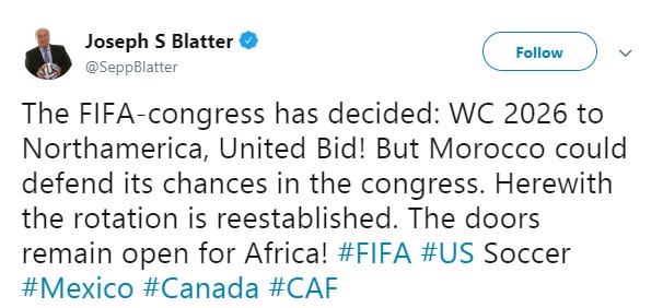وكتب بلاتر، عبر حسابه الشخصي، على موقع "تويتر": "لقد فاز الملف الثلاثي المقدم من أمريكا الشمالية، بتنظيم كأس العالم 2026".