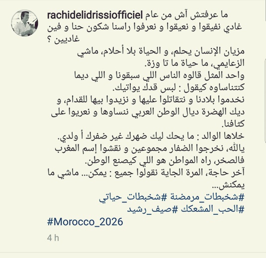 وارتباطا بالموضوع ، كان للإعلامي المغربي رشيد الإدريسي رأي آخر ، حيث نشر  بعيد حسم تنظيم المونديال لفائدة الملف الأمريكي المشترك، تدوينة عبر حسابه على الخاص على الانستغرام، جاء فيها : " ما عرفتش آش من عام غادي نفيقوا و نعيقوا و نعرفوا راسنا شكون حنا و فين غاديين ؟"، قبل أن يواصل : " مزيان الإنسان يحلم، والحياة بلا أحلام، ماشي الزعايمي، ما حياة ما تا وزة ".