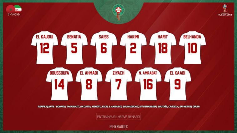 كشف الناخب الوطني هيرفي رونار عن التشكيلة الرسمية للمنتخب الوطني المغربي في مواجهة إيران ، اليوم الجمعة ، برسم الجولة الأولى من نهائيات كأس العالم 2018 بروسيا.