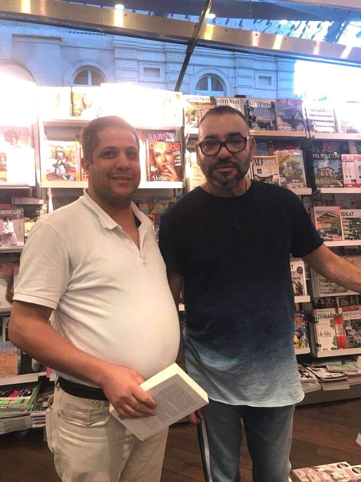 وظهر العاهل المغربي في الصورة التي نشرتها صفحة محمد السادس على الفايسبوك، رفقة مهاجر مغربي يدعى عزيز من مدينة وجدة،  تم التقاطها بإحدى المكتبات بشارع الشانزيليزيه.