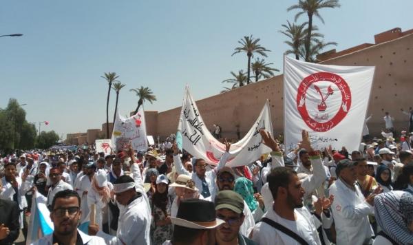 شارك الآلاف من الأساتذة المتعاقدين ، صباح اليوم السبت 23 يونيو ، في ثاني مسيرة وطنية تزامنا مع منتدى الأمم المتحدة حول الوظيفة العمومية بمدينة مراكش ، أعربوا من خلالها عن رفضهم المطلق لخطة التعاقد ، وطالبوا بإسقاطه وإدماجهم في الوظيفة العمومية .
