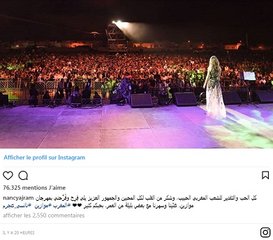 وردّت نانسي من خلال رسالة نشرتها على حسابها على موقع “إنستغرام”، فقد أرفقت صورة التقطت لها أثناء المهرجان بهذا التعليق: “كل الحب والتقدير للشعب المغربي الحبيب وشكر من القلب لكل المحبين والجمهور العزيز يلي فرح وفرحني بمهرجان موازين. غنينا وسهرنا مع بعض بليلة من العمر، بحبكن كتير”.