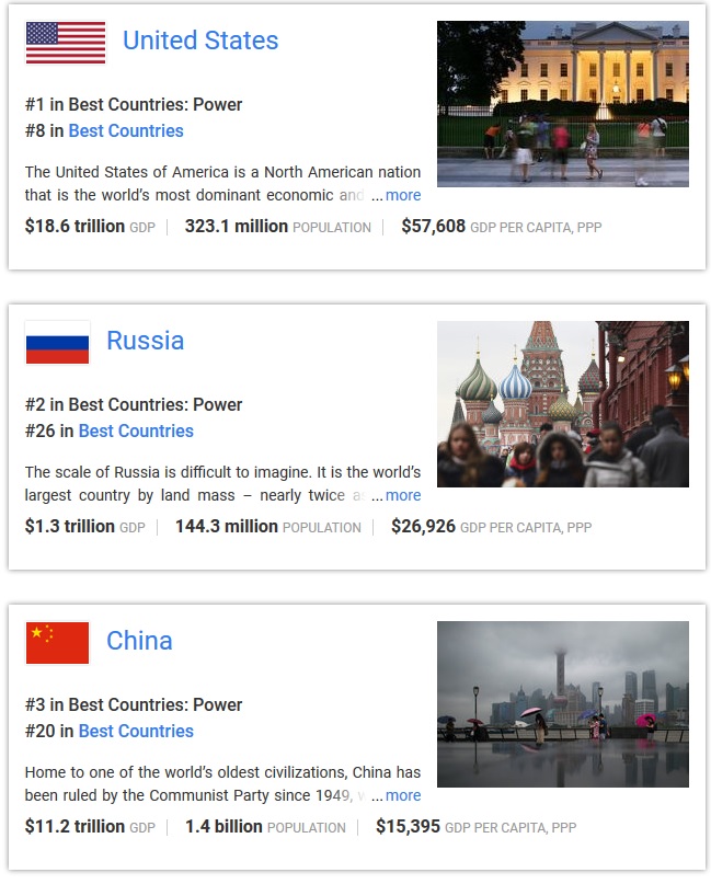 و احتلت الولاية المتحدة الأمريكية الرتبة الأولى متبوعة بروسيا و الصين . و يشمل التصنيف معايير ك الناتج الوطني المحلي و كذا معايير تتعلق بالاقتصاد و السياسة و الصحة و التعليم و جودة الحياة .