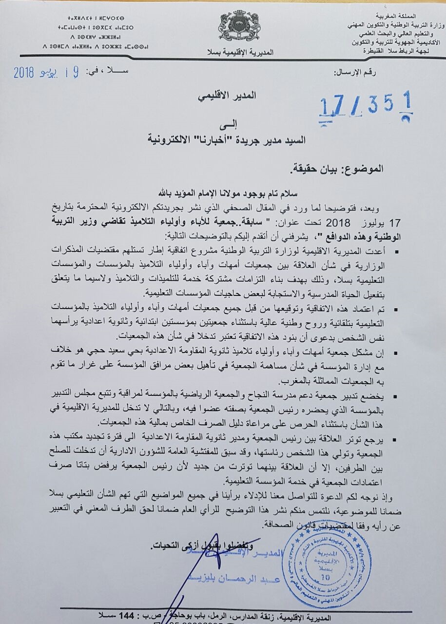سارعت المديرية الاقليمية لوزارة التربية الوطنية بسلا، إلى مراسلة الموقع للرد عن مقال حول عزم جمعية أمهات وآباء وأولياء تلاميذ ثانوية "المقاومة" الاعدادية بحي "سعيد حجي"، مقاضاة وزارة التربية الوطنية.