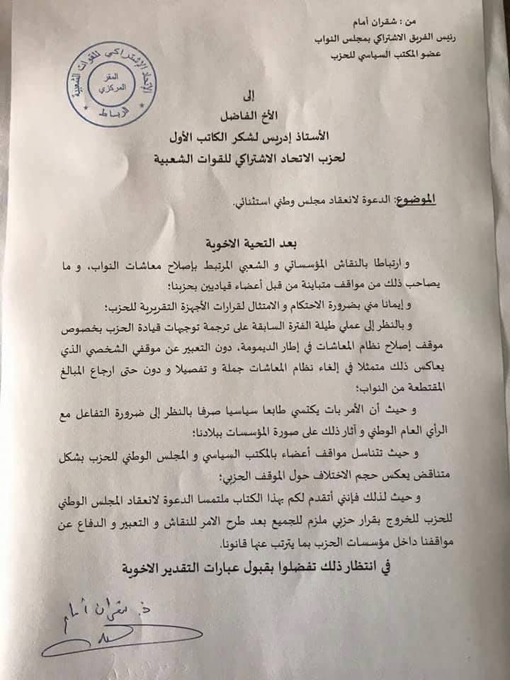 وجه "شقران أمام" رئيس الفريق الإشتراكي بمجلس النواب وعضو المكتب السياسي لحزب "الإتحاد الإشتراكي للقوات الشعبية"، رسالة إلى "الحبيب المالكي" رئيس مجلس النواب ورئيس المجلس الوطني للحزب، بخصوص النقاش الدائر حول معاشات البرلمانيين.