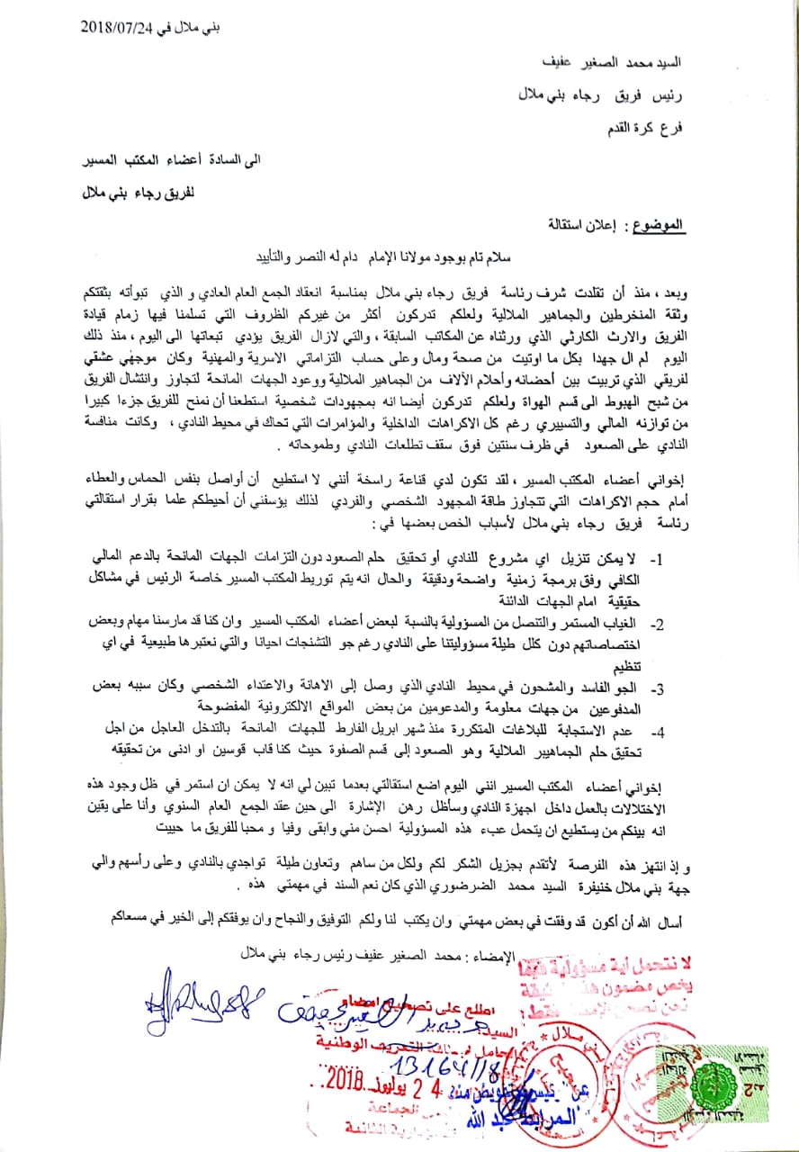 توصلت "أخبارنا" من محمد عفيف الصغير رئيس رجاء بني ملال لكرة القدم، بوثيقة استقالته من منصبه كرئيس للمكتب المسير ، لأسباب واختلالات عديدة أبرزها غياب الدعم المادي من الجهات المانحة ، وتشنج الأجواء في محيط الفريق ، والتهجم على شخصه من جهات لم يسميها.