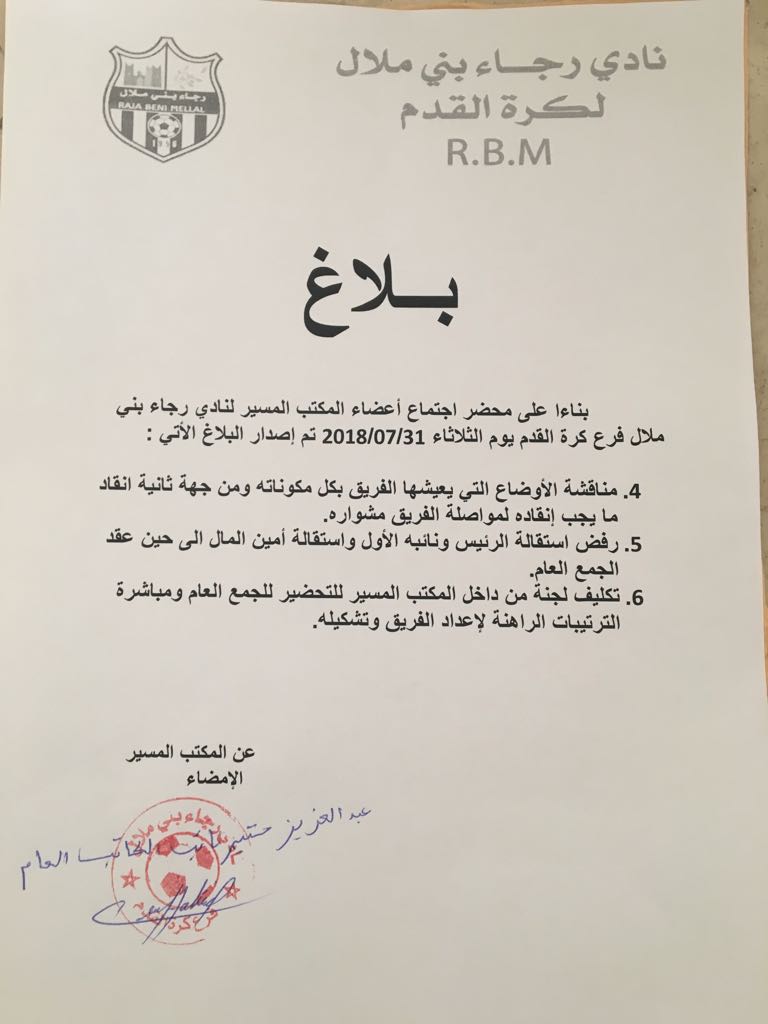 توصلت "أخبارنا" ببلاغ من المكتب المسير لرجاء بني ملال ، حيث اجتمع الأعضاء أمس الثلاثاء لمناقشة مستجدات الفريق والأوضاع التي يعيشها ، لاسيما استقالة الرئيس ونائبه وأمين المال ، واتفق المجتمعون على رفض هذه الاستقالات إلى حين عقد الجمع العام .