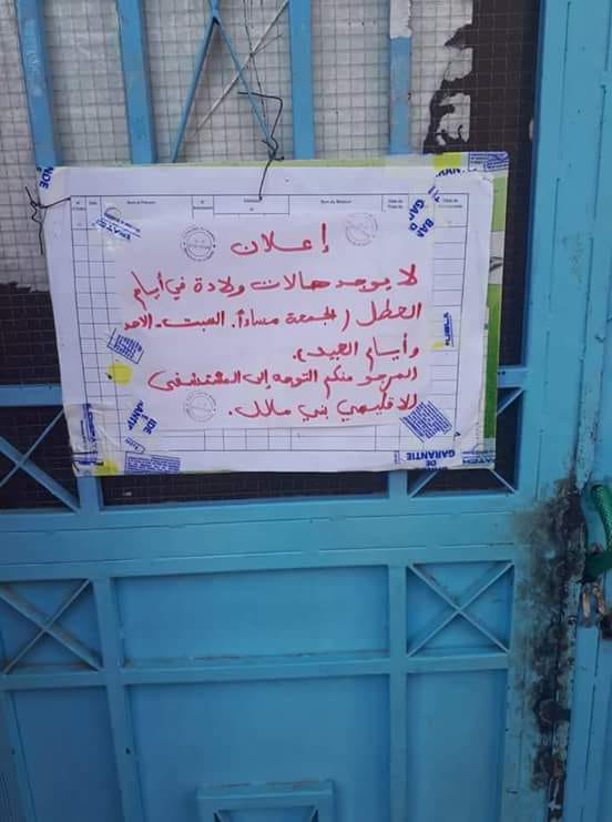 يبدو أن وزارة الصحة تمر بفترات عصيبة بمواقع التواصل الاجتماعي هذا الاسبوع، فبعد فيديو السائحة الفرنسية وفيديو برشيد وبني ملال ، كان لأزيلال نصيب من هذه السخرية ، حيث تداولت صفحات فيسبوكية اعلانا معلق بباب مستشفى عمومي قيل أنه بمنطقة ايت اعتاب ، كتب عليه أصحابه توقيت العمل بالنسبة للولادة ، وأكدوا أن المستوصف لايستقبل النساء ايام العطل ونهاية الاسبوع والعيد .