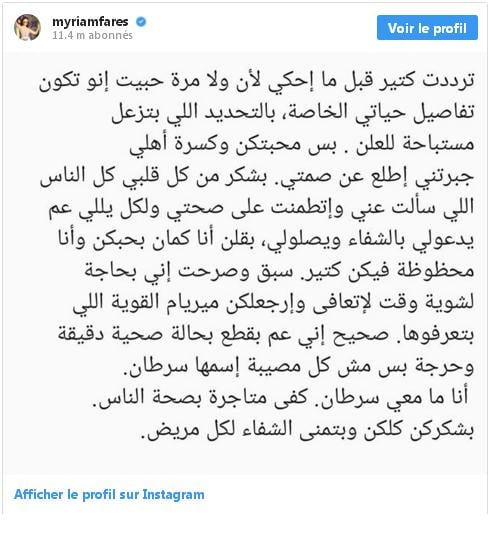 خرجت المغنية اللبنانية ميريام فارس الجمعة عن صمتها ، قائلة "ما معي سرطان" ، ردا على أنباء تداولها ناشطون على مواقع التواصل حول إصابتها بـ"مرض خطير".