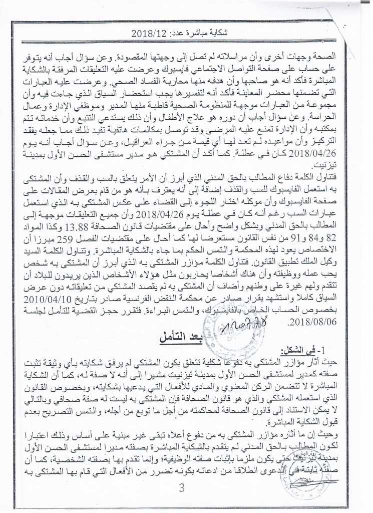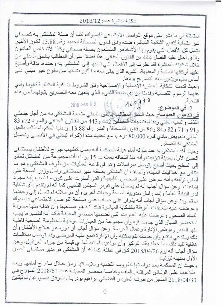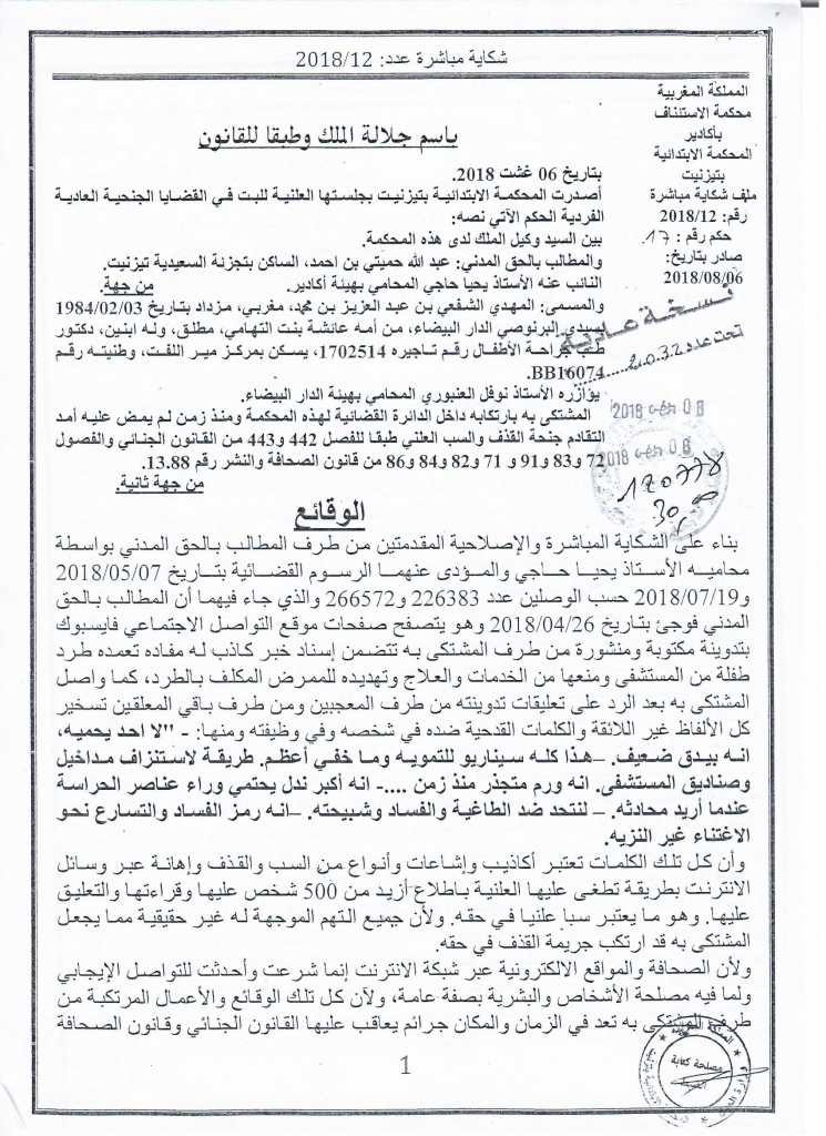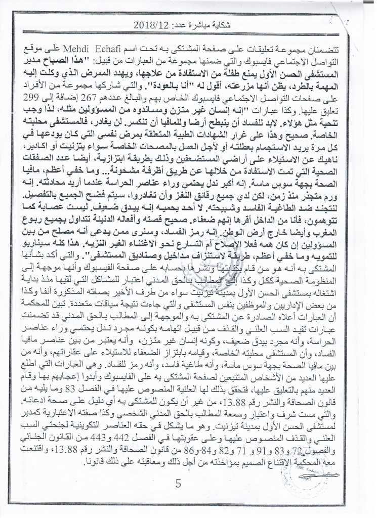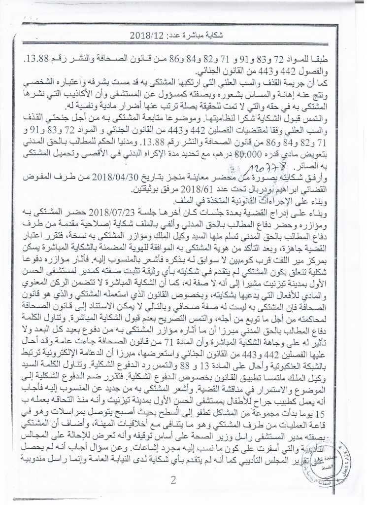 وسبق للمشتكي، أن قدم شكاية مباشرة في حق الدكتور "المهدي الشافعي" وطالبه بتعويض قيمته 80 ألف درهما.