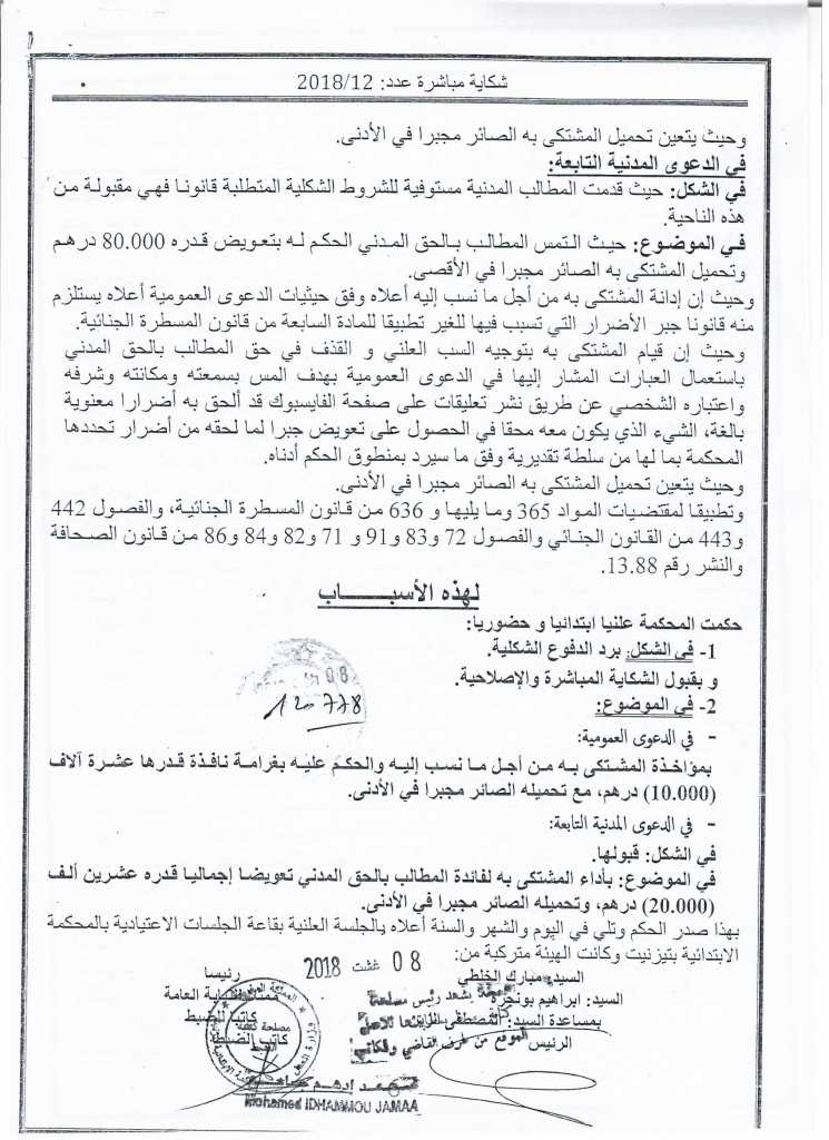 وقضت المحكمة، بتغريم "طبيب الفقراء" مبلغ 10 آلاف درهم، وبأدائه لمبلغ 20 آلاف درهم لفائدة المشتكي، الذي اتهمه(الطبيب) بالسب والقذف عبر "الفايسبوك".