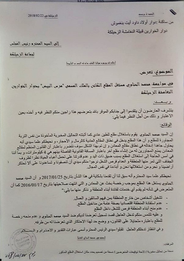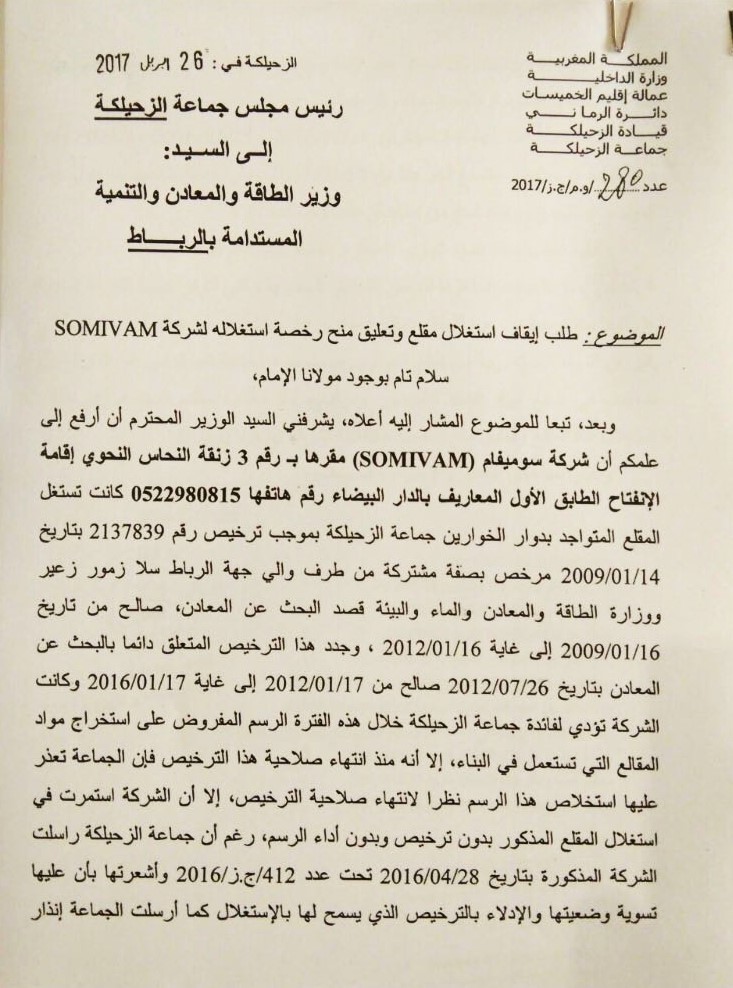 هذه المعطيات التي تحصل عليها " اخبارنا " بشكل حصري، تجرنا للحديث عن موضوع حساس سبق لنا أن تطرق له سابقا، والمتعلق بصمت وزارة الطاقة والمعادن على شركة (SOMIVAM)، المتواجدة بجوار موقع اكتشاف الذهب، لازالت تعمل بشكل غير قانوني منذ تاريخ 16/ 01 / 2016، بعد أن منحت أول الأمر رخصة للتنقيب عن المعادن، بهدف قطع الطريق على جيرانها، للحيلولة دون احداث مقالع منافسة، على اعتبار أن القانون التنظيمي لمقالع المعادن، يمنح المرخص له، حق التنقيب على مساحة تبلغ 4 كلم مربعة، دون أن يحق لجيرانه أن يستغلوا أراضيهم لذات الغرض، الأمر الذي تطرح معه علامات استفهام عريضة جدا، حول طبيعة المواد المستخرجة من قبل هذه الشركة، سيما بعد أن أكد رئيس الجماعة، القيادي الإستقلالي بوعمر تغوان، بمعية السلطات المحلية في مراسلة وجهت إلى الوزير الرباح، أن الشركة المذكورة تعمل منذ التاريخ المذكور سابقا، بكيفية غير قانونية و بدون ترخيص، تعذر على الجماعة بسبب ذلك تحصيل رسومها الضريبية التي كانت تحصلها من قبل، كما أنها لازالت تقوم باستخراج وبيع المواد المستخرجة، وليس فقط التنقيب، وأن العشرات من ساكنة الجماعة وضعوا تعرضهم من أجل إيقاف الشركة المذكورة لعدم قانونيتها، خاصة عقب الأضرار الإقتصادية و الإجتماعية التي تسببت لهم فيها، وهي المطالب التي واجهتها الوزارة، بنهج سياسية " الصمت "، ما زاد من حدة الشكوك، التي ارتفعت وثيرتها بعد توقيف مدير ديوان الوزير الرباح، السيد عدي عزة عن العمل، بعد أن باح للمتضررين أن الملقع موضوع الاحتجاج يعمل بشكل غير قانوني.