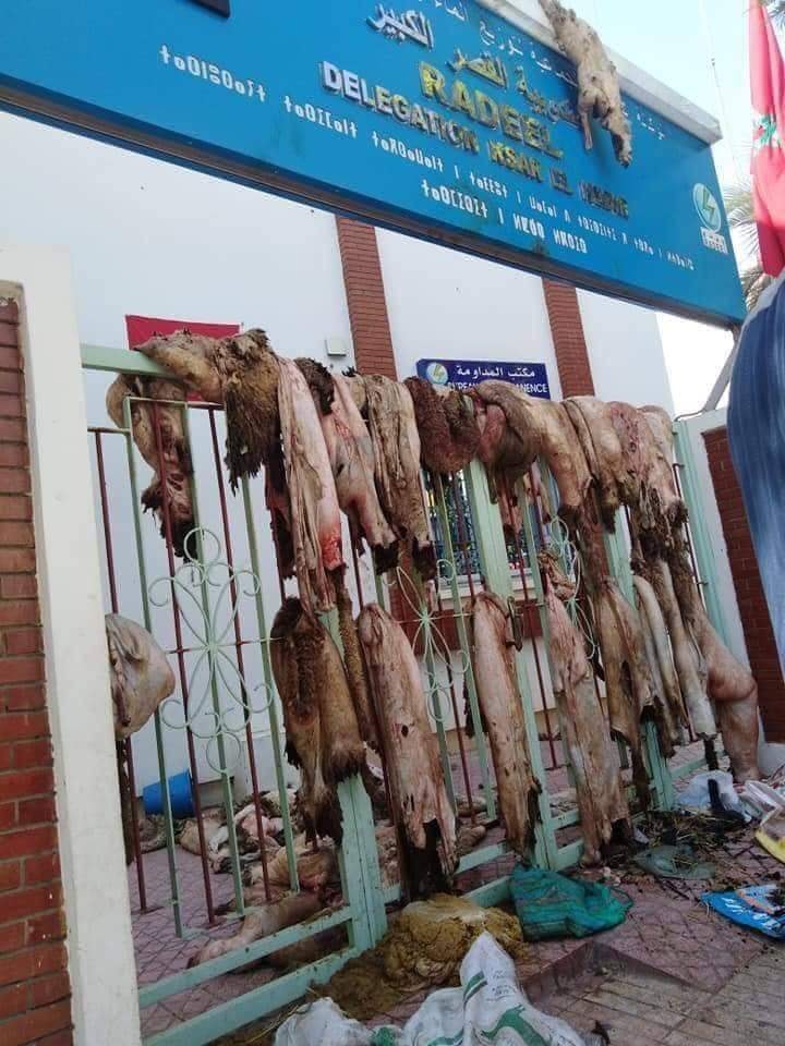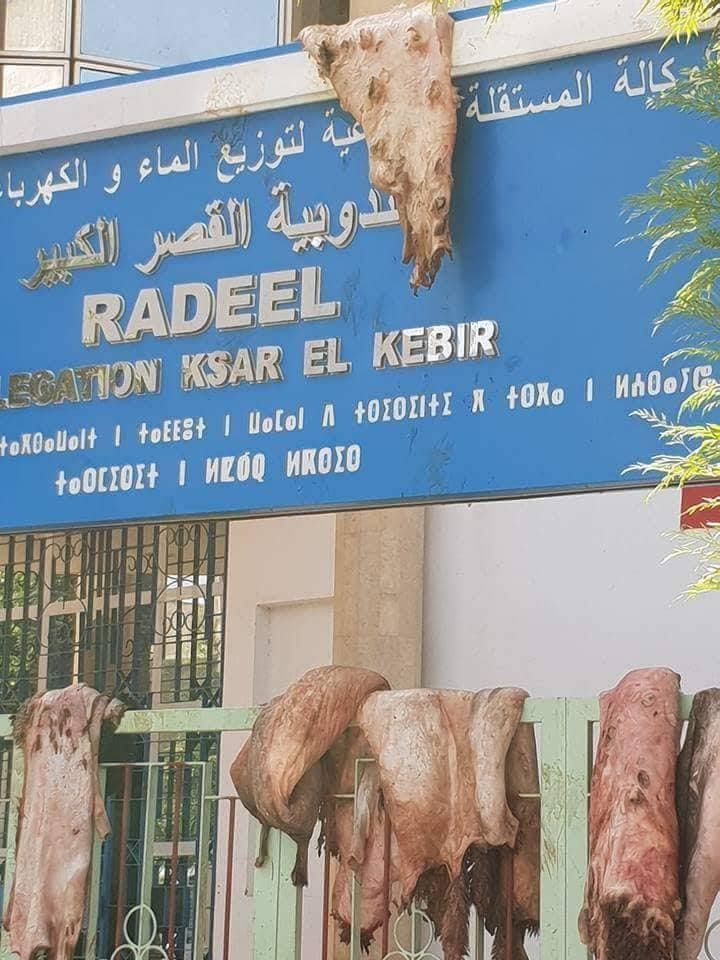 تداولت صفحات مواقع التواصل الاجتماعي، اليوم الاربعاء 22 غشت ، الموافق لأول أيام عيد الاضحى المبارك، صورا مثيرة للجدل من القصر الكبير ، حيث اختارت ساكنة المدينة الاحتجاج على الوكالة المستقلة لتوزيع الكهرباء والماء الصالح للشرب (RADEEL) ، بوضع جلود الأضاحي على بوابة مقرها.