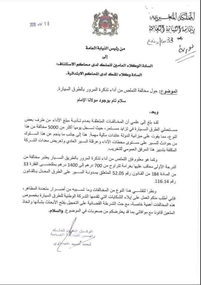 وجه محمد عبد النباوي رئيس النيابة العامة ، مراسلة تتوفر "أخبارنا" على نسخة منها إلى الوكلاء العامين ووكلاء الملك تحثهم على إيلاء شكايات الشركة الوطنية للطرق السيارة ، أهمية خاصة بعد تسحيل أكثر من 5000 مخالفة يوميا تهم التملص من أداء تذكرة "الأوطوروت" ، مما يفوت على ميزانية الدولة عائدات مالية مهمة إلى جانب وقوع حوادث سير بمختلف محطات الأداء ، ما يسبب عرقلة للسير وتعرض معدات الشركة التخريب.
