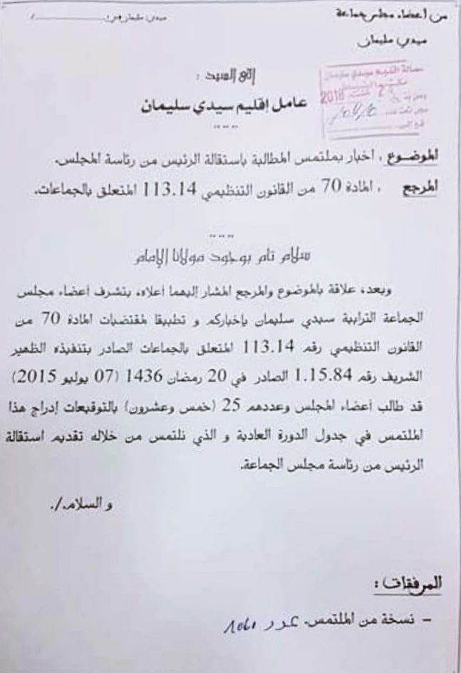 وفق رسالة تحصل موقع " أخبارنا "على نسخة منها، وجه 25 عضوا بالمجلس الجماعي لسيدي سليمان، ملتمسا إلى عامل الإقليم يرمي إلى تقديم رئيس المجلس المنتمي لحزب العدالة والتنمية، لإستقالته من الجماعة، وذلك وفق ما تنص عليه المادة 70 من القانون التنظيمي رقم 113.14 المتعلق بالجماعات.