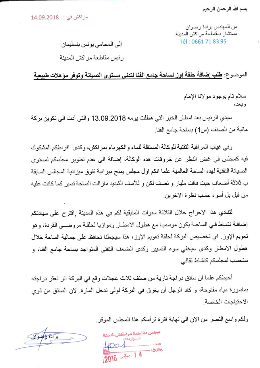 أكد المهندس رضوان برادة، عضو مجلس مقاطعة المدينة، لأخبارنا المغربية، توجيهه فعلا لمراسلة للمحامي يونس بنسليمان رئيس مجلس المقاطعة المذكورة، يطالبه فيها بإضافة حلقة إوز لساحة جامع الفنا المعروفة بعد أمطار الخير التي عرفتها المدينة في 13 من الشهر الجاري.
