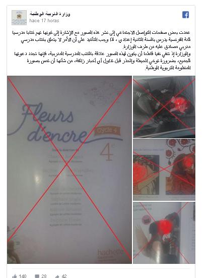 وقالت الوزارة في تدوينة عبر حسابها بالفايسبوك "عمدت بعض صفحات التواصل الاجتماعي إلى نشر هذه الصور مع الإشارة إلى كونها تهم كتابا مدرسيا للغة الفرنسية يدرس بالسنة الثانية إعدادي ، لذا وجب التأكيد على أن الأمر لا يتعلق بكتاب مدرسي مغربي مصادق عليه من طرف الوزارة".