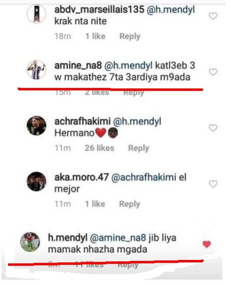 وكتب أحد المعلقين بالانستغرام "كتلعب 3 ومكتهزش حتى عرضية مكادة"، ليرد عليه لاعب شالكة الالماني "جيب ليا ماماك نهزها مقادة".