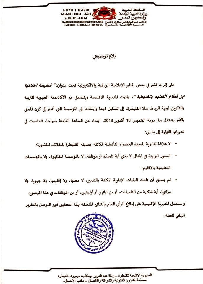 المديرية الإقليمية للتربية و التكوين بالقنيطرة، خرجت قبل لحظات ببلاغ، نفت عبره أن تكون الثانوية المذكورة على صلة بما تروجه بعض المنابر الإعلامية، موضحة أن الصور المتداولة في المقال، لا تعني أي تلميذة أو موظفة بالمؤسسة المذكورة، ولا حتى بالمؤسسات التعليمية بالقنطرة عموما، مشددا على أن البنيات الإدارية المكلفة بالتدبير لم يسبق لها أن تلقت أي شكاية في الموضوع.