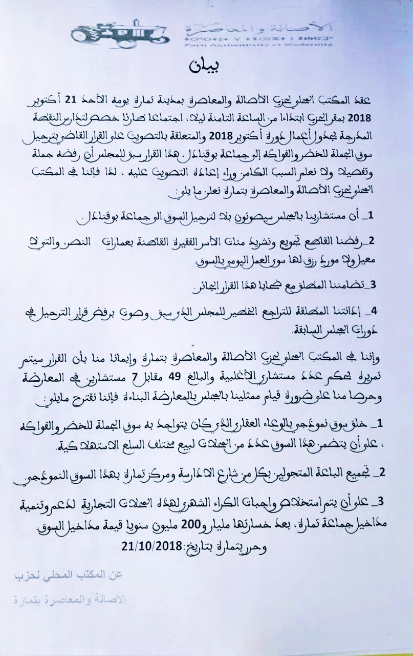 حالة من الغضب الشديد، عاشتها مدينة تمارة اليوم الثلاثاء، عقب تصويت المجلس الجماعي، الذي يقوده حزب العدالة والتنمية بأغلبية ساحقة، للمرة الثانية على التوالي، على قرار يقضي بنقل سوق الخضر والفواكه المحلي، إلى جماعة بوقنادل، تفعيلا لاتفاقية شراكة ترمي إلى إحداث مجمع لتسويق المنتجات الفلاحية و الغذائية لعمالات الرباط، سلا، الصخيرات، تمارة وإقليم القنيطرة.