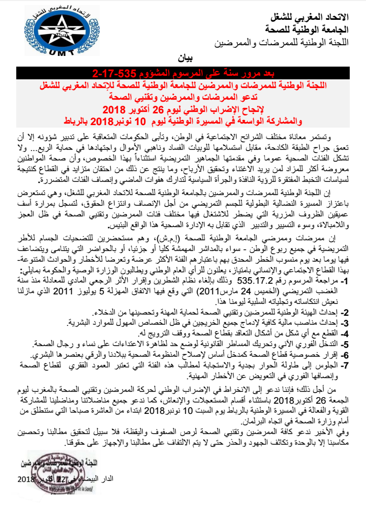 من أجل ذلك؛ فإننا ندعو إلى الانخراط في الإضراب الوطني لحركة الممرضين وتقنيي الصحة بالمغرب ليوم الجمعة 26أكتوبر2018 باستثناء أقسام المستعجلات والإنعاش، كما ندعو جميع مناضلاتنا ومناضلينا للمشاركة القوية والفعالة في المسيرة الوطنية بالرباط يوم السبت 10 نونبر2018 ابتداء من العاشرة صباحا التي ستنطلق من أمام وزارة الصحة في اتجاه البرلمان.