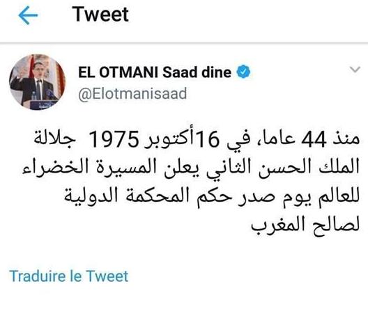 وقال العثماني، في تغريدة على "تويتر" : "منذ 44 عاما، في 6 نونبر 1975 جلالة الملك الحسن الثاني يعلن المسيرة الخضراء للعالم يوم صدر حكم المحكمة الدولية لصالح المغرب".