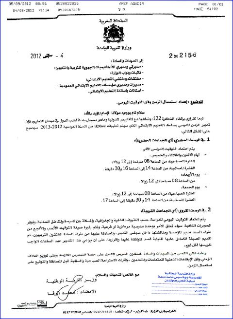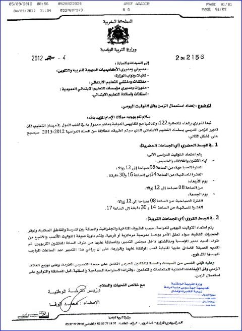 وألغى الوفا المذكرة 122 التي كانت تحدد سابقا الزمن المدرسي بسلك التعليم الإبتدائي، ووجه مذكرة أخرى "تماشيا مع المقاييس الدولية وما هو معمول به في أغلب الدول في ميدان التعليم، بخصوص تدبير الزمن المدرسي".
