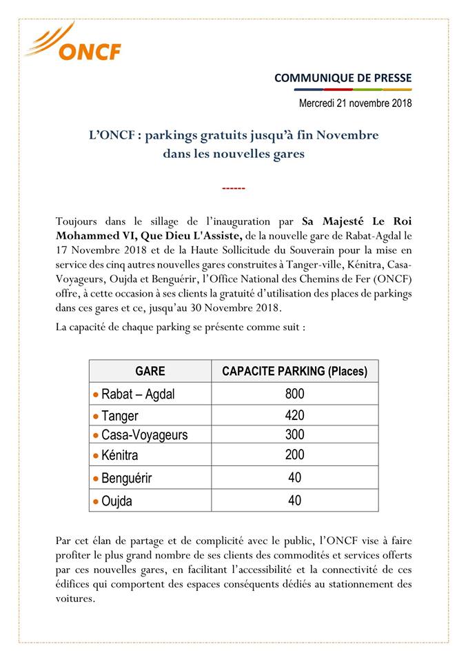 أعلن المكتب الوطني للسكك الحديدية، أن استعمال مرائب السيارات بالمحطات المشيدة حديثا ، سيكون بالمجان الى غاية 30 نوفمبر الجاري.