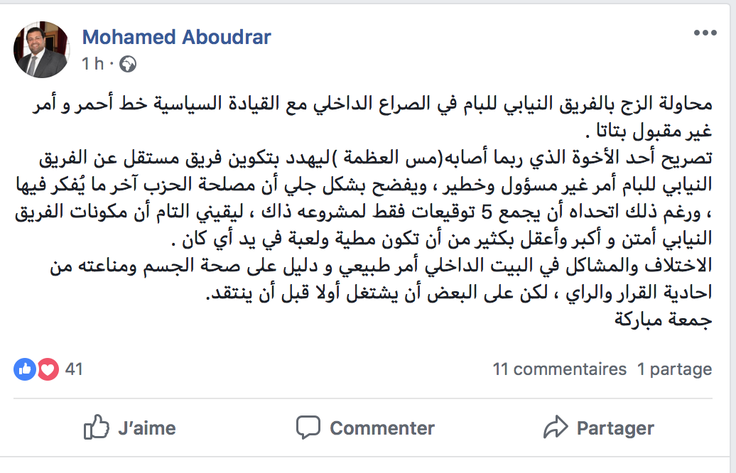 الرد على تصريحات وهبي المثيرة لم يتأخر طويلا، حيث نشر البرلماني " الباعمراني " السيد محمد أبو درار، تدوينة عبر حسابه الخاص على الفيسبوك، أكد خلالها أن : "محاولة الزج بالفريق النيابي للبام في الصراع الداخلي مع القيادة السياسية خط أحمر و أمر غير مقبول بتاتا"، في إشارة إلى تصريح " وهبي "، موضحا أن : " تصريح أحد الإخوة الذي ربما أصابه( مس العظمة ) هدد عبره بتكوين فريق مستقل عن الفريق النيابي للبام، أمر غير مسؤول وخطير، ويفضح بشكل جلي أن مصلحة الحزب آخر ما يُفكر فيها، ورغم ذلك اتحداه أن يجمع 5 توقيعات فقط لمشروعه ذلك، ليقيني التام أن مكونات الفريق النيابي أمتن وأكبر وأعقل بكثير من أن تكون مطية ولعبة في يد أي كان "، قبل أن يختم عضو لجنة المالية بالغرفة الأولى تدوينته بالتأكيد على أن : "الاختلاف والمشاكل في البيت الداخلي أمر طبيعي و دليل على صحة الجسم، ومناعته من أحادية القرار والرأي، لكن على البعض أن يشتغل أولا قبل أن ينتقد ".