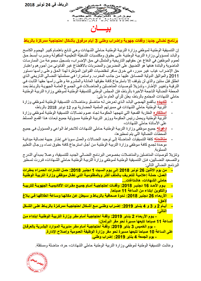 دعت التنسيقية الوطنية للأساتذة حاملي الشهادات إلى الاستمرارا في مسلسلها النضالي حيث قررت تصعيد احتجاجاتها ضد وزارة التربية الوطنية والتكوين المهني والتعليم العالي والبحث العلمي للضغط من أجل استرجاع “الحق في الترقية، وتغيير الإطار” الذي توقفت الحكومة، منذ ثلاث سنوات، عن العمل به . و نددت بالقمع الذي تعرض له مناضلوها في مسيرتهم السلمية يوم 12 نونبر 2018 بالرباط، مؤكدة دعوتها جميع موظفي وزارة التربية الوطنية حاملي الشهادات للانخراط الواعي والمسؤول في جميع المحطات النضالية التي يتم تسطيرها،